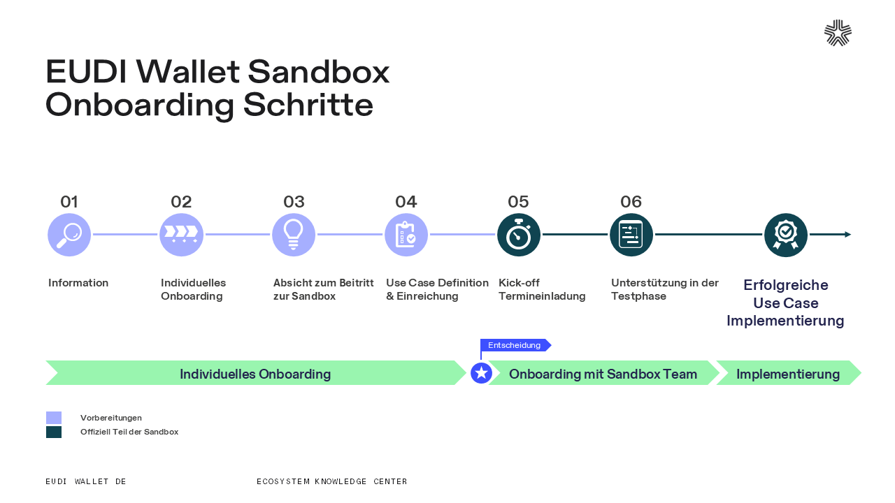 Die nationale EUDI-Wallet-Sandbox ist ein grundlegender Bestandteil des deutschen EUDI-Wallet-Ökosystems. Die Teilnahme an der Sandbox ist ein verpflichtender Schritt für jede Organisation, die Dienste in der Live-Umgebung der EUDI-Wallet anbieten möchte.